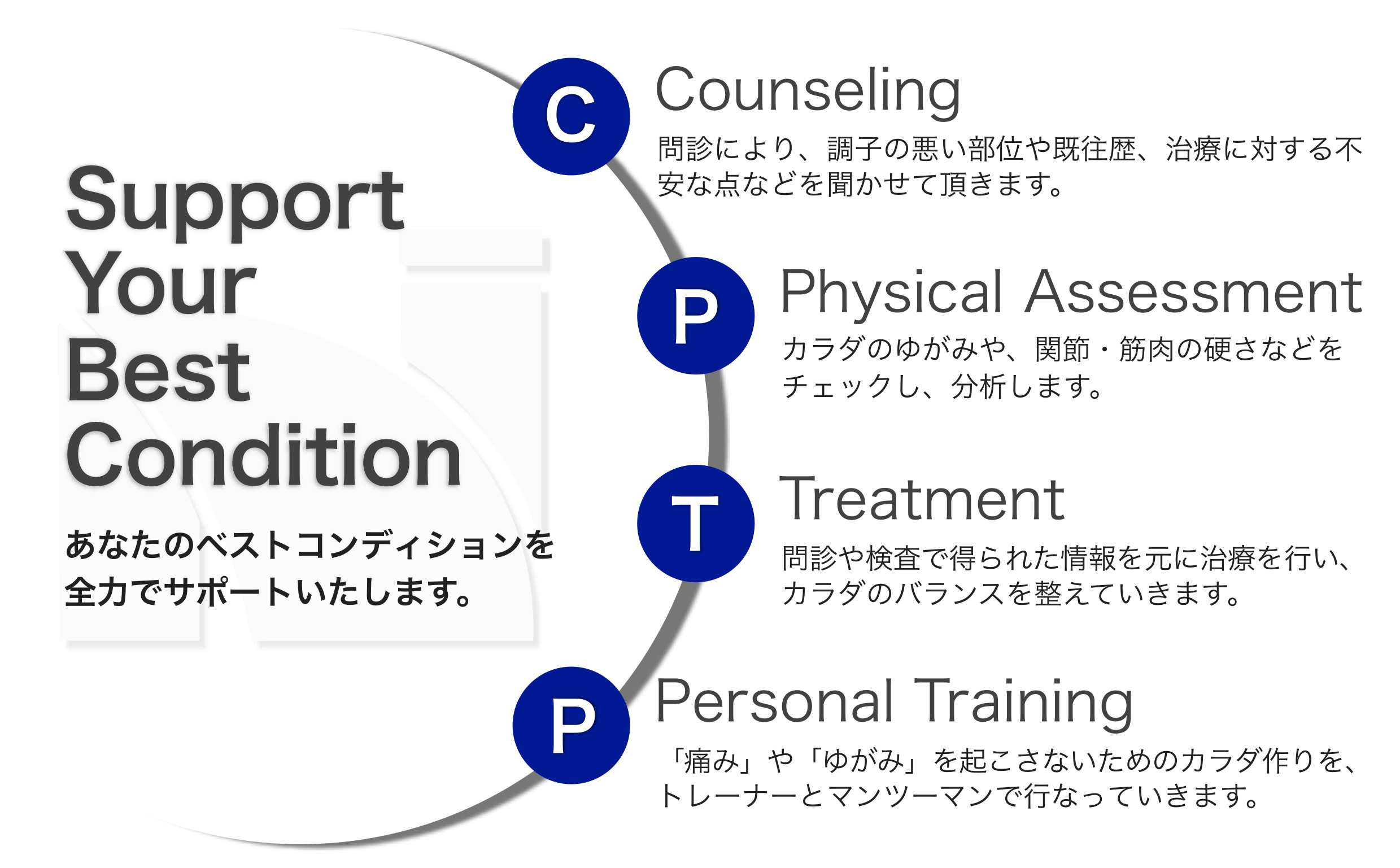 治療やトレーニングによって、痛みのないバランスの良い身体を作る手助けをさせて頂きます。